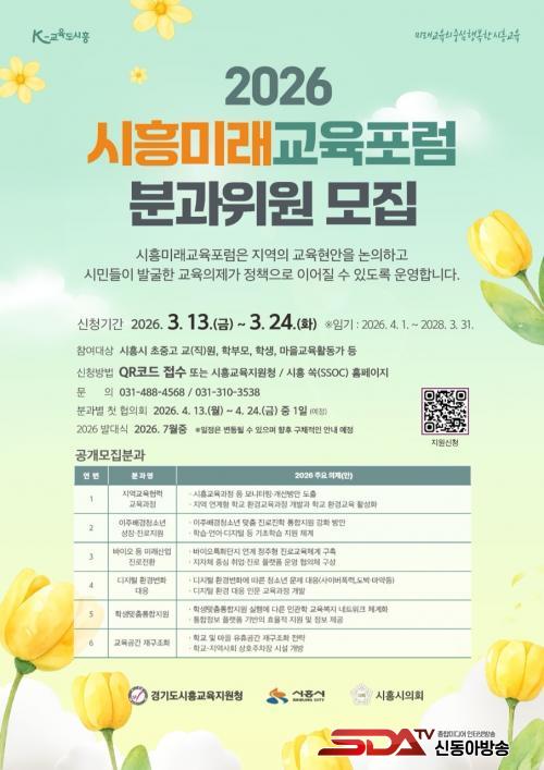 ½ÃÈï½Ã Çлý, ±³(Á÷)¿ø°ú Çкθð, ¸¶À»±³À°È°µ¿°¡ µî ½ÃÈï½Ã¹Î ´©±¸³ª ºÐ°úÀ§¿ø ¸ðÁý¿¡ Âü¿©ÇÒ ¼ö ÀÖ´Ù. ½ÅûÀº ½ÃÈï±³À°Áö¿øÃ» ¹× ½ÃÈï±³À°Ä·ÆÛ½º ¡®½ï(SSOC)¡¯ ´©¸®ÁýÀÇ °øÁö»çÇ×(https://siheung.gseek.kr)¿¡¼ °¡´ÉÇϸç, È«º¸¹°¿¡ ¾È³»µÈ Á¤º¸¹«´Ì(Å¥¾ËÄÚµå) ȤÀº ¸µÅ©(https://naver.me/G9UNIcd4)·Îµµ ½ÅûÇÒ ¼ö ÀÖ´Ù. ºÐ°úÀ§¿øÀÇ ÀÓ±â´Â 4¿ù 1ÀϺÎÅÍ 2028³â 3¿ù 31ÀϱîÁöÀ̸ç, ºÐ°úº° ù ÇùÀÇȸ´Â ¿À´Â 4¿ù Áß¿¡ ÁøÇàµÇ°í Æ÷·³ ¹ß´ë½ÄÀº 7¿ù ¿¸± ¿¹Á¤ÀÌ´Ù.