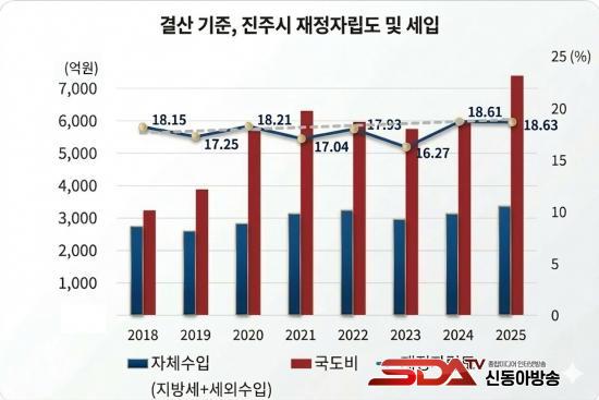 ÇÑÆí, ÁøÁÖ½ÃÀÇ °á»ê ±âÁØ ÀçÁ¤ÀÚ¸³µµ´Â 2018³â 18.15%¿¡¼ 2025³â 18.63%¸¦ ±â·ÏÇϸç Å« º¯µ¿ ¾øÀÌ À¯ÁöµÇ°í ÀÖ´Ù. 2023³â¿¡ ´«¿¡ ¶ç°Ô Ç϶ôÇÑ °ÍÀº ±¹¼¼Ã»ÀÌ Çѱ¹ÅäÁöÁÖÅðø»ç(LH)ÀÇ ¹ýÀμ¼¸¦ ȯ±ÞÇϸé¼, ÁøÁֽõµ ¹ýÀÎÁö¹æ¼Òµæ¼¼¸¦ ȯ±ÞÇ߱⠶§¹®À¸·Î ºÐ¼®µÈ´Ù.