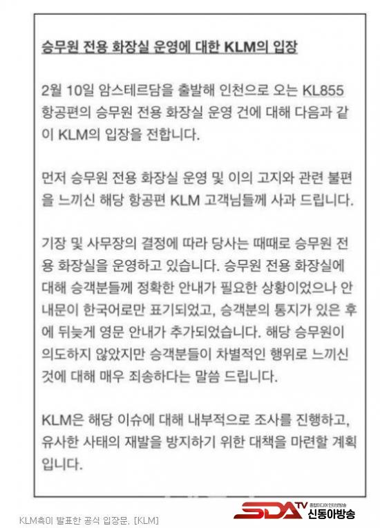 Çѱ¹¾î·Î¸¸ Ç¥±âÇØ µÐ °øÁö À̰°Àº ÁÖÀåÀÌ »ç½ÇÀ̶ó¸é, KLM ½Â¹«¿øÀº ÀÎÁ¾Â÷º°Àû Ç¥ÇöÀ» Çß´Ù´Â ÇøÀÇ¿Í »çÁøÀ» Áö¿ìµµ·Ï °¿äÇÑ ÇøÀǸ¦ ¹Þ´Â´Ù. °¢ °¢ ¸ð¿åÁË¿Í °¿äÁË¿¡ ÇØ´çÇÒ ¼ö ÀÖ´Ù.