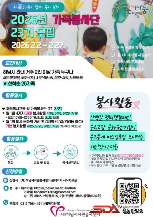 ¸ðÁý ´ë»óÀº Çϳ²½Ã¿¡ °ÅÁÖÇÏ´Â 2ÀÎ ÀÌ»óÀÇ °¡Á·À̸ç, Á¢¼ö´Â 2026³â 2¿ù 27ÀÏ(±Ý)±îÁö ÁøÇàµÈ´Ù. ¼±Âø¼ø ¸ðÁýÀ¸·Î Á¤¿ø Ãæ¿ø ½Ã Á¶±â ¸¶°¨µÉ ¼ö ÀÖ´Ù.