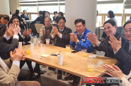 »çÁø¼³¸í: ±è¿µ±Ô ¿©¼ö½ÃÀå ¿¹ºñÈĺ¸(ÆÄ¶õ»ö Á¡ÆÛ)°¡ Áֹεé°ú Â÷´ãȸ¸¦ ÇÏ¸é¼ È¯ÇÏ°Ô ¿ô´Â Ç¥Á¤À¸·Î ¹Ú¼ö¸¦ Ä¡°í ÀÖ´Ù.