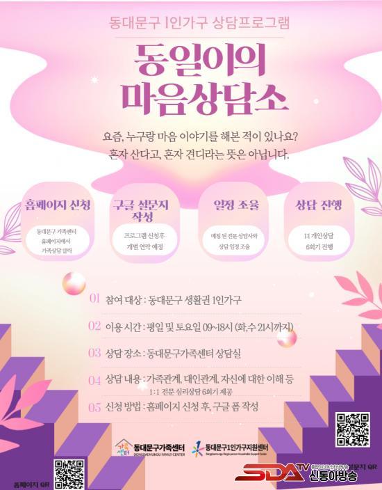 ¸ÕÀú ¡¸µ¿ÀÏÀÌÀÇ ¸¶À½»ó´ã¼Ò¡¹´Â ÀÏ»ó ¼Ó Á¤¼Àû ¾î·Á¿òÀ» °Þ´Â 1Àΰ¡±¸¸¦ ´ë»óÀ¸·Î 1:1 Àü¹® ½É¸®»ó´ãÀ» Á¦°øÇÏ´Â ÇÁ·Î±×·¥ÀÌ´Ù. Âü¿©ÀÚ´Â »çÀü ¼³¹®À» ÅëÇØ °í¹Î°ú »óȲÀ» ÆÄ¾ÇÇÑ µÚ Àü¹® »ó´ã»ç¿Í ¿¬°áµÇ¸ç, ÃÑ 6ȸ±â¿¡ °ÉÃÄ °³ÀÎ ¸ÂÃãÇü »ó´ãÀ» ¹Þ°Ô µÈ´Ù.