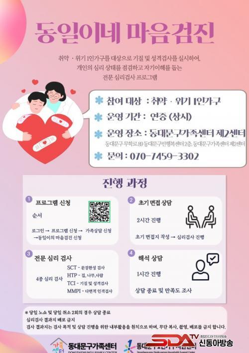 À̹ø »ç¾÷Àº ¡¸µ¿ÀÏÀÌÀÇ ¸¶À½»ó´ã¼Ò¡¹¿Í ¡¸µ¿ÀÏÀÌÀÇ ¸¶À½°ËÁø¡¹ µÎ °¡Áö ÇÁ·Î±×·¥À¸·Î ±¸¼ºµÇ¸ç, 1Àΰ¡±¸ÀÇ ½É¸® ȸº¹ºÎÅÍ À§±â °¡±¸ Á¶±â ¹ß±¼±îÁö ´Ü°èº° ¸ÂÃã Áö¿øÀ» Á¦°øÇÏ´Â °ÍÀÌ Æ¯Â¡ÀÌ´Ù.