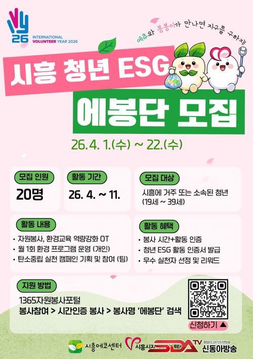 ¡®Ã»³â ESG ¿¡ºÀ´Ü¡¯Àº ½ÃÈï¿¡ÄÚ¼¾ÅÍ Ä³¸¯ÅÍ ¡®¿¡Ãò¡¯¿Í ½ÃÈï½ÃÀÚ¿øºÀ»ç¼¾ÅÍÀÇ ¡®ºÀºÀ¡¯À» °áÇÕÇØ ¸¸µç ¸íĪÀ¸·Î, û³â ´ë»ó ¼ö¿äÁ¶»ç¸¦ ¹ÙÅÁÀ¸·Î µÎ ±â°üÀÌ Çù¾÷ÇØ ±âȹµÆ´Ù.