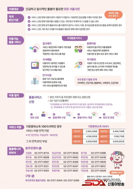 ±ä±ÞÇϰí ÀϽÃÀû µ¹º½ÀÌ ÇÊ¿äÇÑ ¼¿ï½Ã¹ÎÀ» ´ë»óÀ¸·Î 5´ë µ¹º½¼ºñ½º(¡ãÀϽÃÀç°¡ ¡ã´Ü±â½Ã¼³ ¡ãµ¿ÇàÁö¿ø ¡ãÁÖ°ÅÆíÀÇ ¡ã½Ä»ç¹è´Þ)¿Í 5´ë ÁßÀå±â µ¹º½¿¬°è(¡ã¾ÈºÎÈ®ÀÎ ¡ã°Ç°Áö¿ø ¡ãµ¹º½Á¦µµ ¡ã»ç·Ê°ü¸® ¡ã±ä±ÞÁö¿ø) µî ¸ÂÃãÇü 10´ë µ¹º½¼ºñ½º¸¦ Áö¿øÇϰí ÀÖ´Ù. Àú¼ÒµæÃþ ¹× ÁßÀ§¼Òµæ 100% ÀÌÇÏ °¡±¸¿¡´Â Àü¾× Áö¿øµÇ¸ç, ±× ¿Ü °¡±¸´Â Àü¾× º»ÀÎ ºÎ´ãÀÌ´Ù.