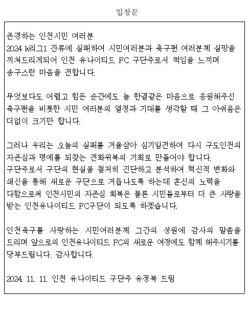 [½Åµ¿¾Æ¹æ¼Û ÀÎõ= À±¹Î½Ä±âÀÚ] ÀÎõÀ¯³ªÀÌÆ¼µå FCÀÇ ±¸´ÜÁÖ À¯Á¤º¹ ÀÎõ±¤¿ª½ÃÀåÀº ÀÎõÀ¯³ªÀÌÆ¼µå FC°¡ 2024 K¸®±×1 ÀÜ·ù¿¡ ½ÇÆÐÇÑ °Í°ú °ü·ÃÇØ ÀÎõ½Ã¹Î°ú Ã౸ ÆÒ ¿©·¯ºÐ²² ±íÀº »ç°ú¿Í ÇÔ²² ÀÔÀåÀ» ¹ßÇ¥Çß´Ù. ±¸´ÜÁÖ´Â À̹ø °­µîÀ¸·Î ÀÎõ½Ã¹Î°ú Ã౸ ÆÒµé¿¡°Ô¡¦