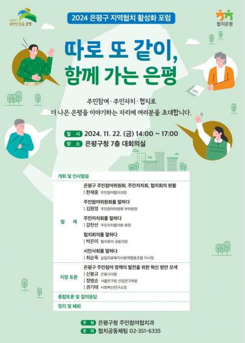 [½Åµ¿¾Æ¹æ¼Û ÀºÆò±¸=À̽ŵ¿±âÀÚ] ÀºÆò±¸´Â ¡®2024 ÀºÆò±¸ Áö¿ªÇùÄ¡ Ȱ¼ºÈ­ Æ÷·³ : µû·Î ¶Ç °°ÀÌ, ÇÔ²² °¡´Â ÀºÆò¡¯À» ¿À´Â 22ÀÏ °³ÃÖÇÑ´Ù°í ¹àÇû´Ù. À̹ø Æ÷·³Àº ÁÖ¹ÎÂü¿© À¯°üÁ¶Á÷ÀÎ ÁÖ¹ÎÂü¿©À§¿øÈ¸, ÁÖ¹ÎÀÚġȸ, ÇùġȸÀÇ¿Í Áö¿ª´Üü, ±¸ÀÇȸ, Àü¹®°¡ µî ´Ù¾çÇÑ ÁÖ¡¦