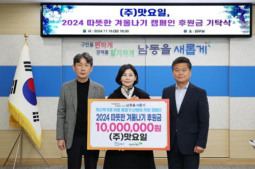 [½Åµ¿¾Æ¹æ¼Û ÀÎõ= À±¹Î½Ä±âÀÚ] ÀÎõ½Ã ³²µ¿±¸´Â ÁÖ½Äȸ»ç ¸À¿äÀÏ(´ëÇ¥ Ȳ¸í¼ø)·ÎºÎÅÍ Ãë¾à°èÃþ ¾Æµ¿ÀÇ ³­¹æºñ Áö¿øÀ» À§ÇÑ ¡®2024 ³²µ¿±¸ µû¶æÇÑ °Ü¿ï³ª±â¡¯ ÈÄ¿ø±Ý 1õ¸¸ ¿øÀ» ±âŹ¹Þ¾Ò´Ù°í 21ÀÏ ÀüÇß´Ù. ÁÖ½Äȸ»ç ¸À¿äÀÏÀº ³²µ¿±¹°¡»ê¾÷´ÜÁö¿¡ ¼ÒÀçÇÑ ½ÄÀ°°¡°ø¡¦