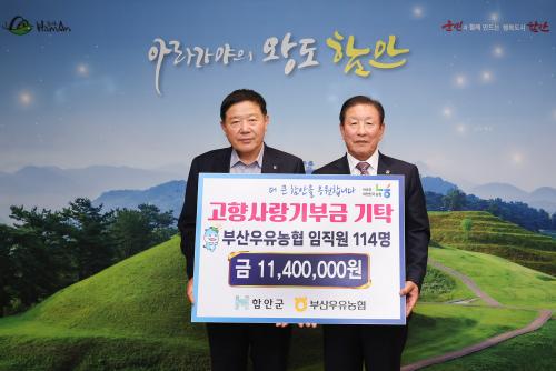 [½Åµ¿¾Æ¹æ¼Û °æ³²ÇÔ¾È=À̽ŵ¿±âÀÚ] ÇԾȱºÀº 25ÀÏ ºÎ»ê¿ìÀ¯³óÇù ÀÓÁ÷¿ø Àϵ¿ÀÌ °íÇâ»ç¶û±âºÎ±Ý 1140¸¸ ¿øÀ» ±âŹÇß´Ù°í ¹àÇû´Ù. ºÎ»ê¿ìÀ¯³óÇùÀÇ À̹ø °íÇâ»ç¶û±âºÎ´Â °­·¡¼ö Á¶ÇÕÀåÀ» ºñ·ÔÇØ Á÷¿ø 114¸íÀÇ ÀÚ¹ßÀû µ¿ÂüÀ¸·Î ÀÌ·ïÁ³´Ù. À̳¯ ¿ÀÈÄ ±âºÎ½Ä¿¡´Â ºÎ»ê¿ìÀ¯¡¦
