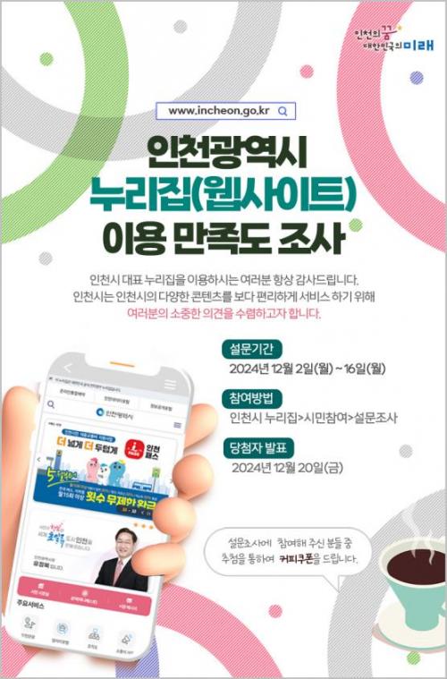 [½Åµ¿¾Æ¹æ¼Û ÀÎõ= À±¹Î½Ä±âÀÚ]ÀÎõ±¤¿ª½Ã(½ÃÀå À¯Á¤º¹)´Â ½Ã¹ÎµéÀÌ ½ÃÁ¤Á¤º¸¿¡ º¸´Ù ½±°Ô Á¢±ÙÇϰí Ȱ¿ëÇÒ ¼ö ÀÖµµ·Ï, ÀÎõ½Ã ´ëÇ¥ ´©¸®Áý(www.incheon.go.kr)À» ÅëÇØ ½Ã¹Î ¼³¹®Á¶»ç¿Í ÀÎõµðÁöÅнÃÁ¤ ÄûÁî À̺¥Æ®¸¦ ÁøÇàÇÑ´Ù°í ¹àÇû´Ù. ¼³¹®Á¶»ç´Â 12¿ù 2ÀϺÎÅÍ 1¡¦