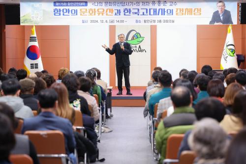 [½Åµ¿¾Æ¹æ¼Û °æ³²ÇÔ¾È=À̽ŵ¿±âÀÚ] ÇԾȱºÀº 6ÀÏ ¿ÀÈÄ 2½Ã ±ºÃ» 3Ãþ ´ëȸÀǽǿ¡¼­ ¡®³ªÀÇ ¹®È­À¯»ê´ä»ç±â¡¯ ½Ã¸®ÁîÀÇ ÀúÀÚÀÌÀÚ Àü ¹®È­ÀçûÀåÀÎ À¯È«ÁØ ±³¼ö¸¦ ÃÊÃ»ÇØ Á¦175ȸ ÇԾȱº¹Î´ëÇÐ °­Á¸¦ °³ÃÖÇß´Ù. À̹ø °­¿¬Àº ¡®ÇÔ¾ÈÀÇ ¹®È­À¯»ê°ú Çѱ¹°í´ë»çÀÇ Á¤Ã¼¼º¡¦