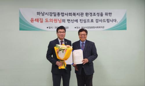 [½Åµ¿¾Æ¹æ¼Û Çϳ²½Ã=À̽ŵ¿±âÀÚ] »çȸº¹Áö¹ýÀÎ ÈÞ¸Õº¹Áöȸ´Â 11¿ù 29ÀÏ(±Ý), Çϳ²½Ã º¹Áöȯ°æ °³¼±¿¡ ¾ÕÀå¼­°í ÀÖ´Â °æ±âµµÀÇȸ º¸°Çº¹ÁöÀ§¿øÈ¸ À±Å±æ ÀÇ¿ø¿¡°Ô °¨»çÀåÀ» Àü´ÞÇÏ¿´´Ù. À̹ø °¨»çÀå Àü´ÞÀº »çȸº¹Áö¹ýÀÎ ÈÞ¸Õº¹Áöȸ¿¡¼­ À§Å¹ ¿î¿µÇϰí ÀÖ´Â Çϳ²½Ã°¨ÀÏ¡¦