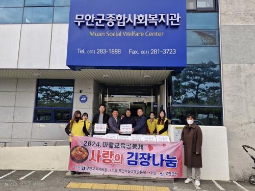 [½Åµ¿¾Æ¹æ¼Û Àü³²¹«¾È=À̽ŵ¿±âÀÚ] ¹«¾È±³À°Áö¿øÃ»Àº 12¿ù 9ÀÏ(¿ù), »ç¶ûÀÇ ±èÀå ³ª´® Çà»çÀÇ ÀÏȯÀ¸·Î ±èÀå ±èÄ¡ 100Æ÷±â¸¦ ÀÏ·ÎÀ¾¿¡ À§Ä¡ÇÑ ¹«¾È±ºÁ¾ÇÕ»çȸº¹Áö°ü¿¡ Àü´ÞÇÏ¿´´Ù. º» Çà»ç´Â ±èÀå ±èÄ¡¸¦ °á½Ä¾Æµ¿, µ¶°Å³ëÀÎ, Àç°¡ Àå¾ÖÀÎ µî µµ¿òÀÌ ÇÊ¿äÇÑ ÀÌ¿ô¿¡¡¦