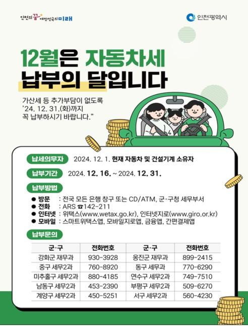 [½Åµ¿¾Æ¹æ¼Û ÀÎõ= À±¹Î½Ä±âÀÚ] ÀÎõ±¤¿ª½Ã(½ÃÀå À¯Á¤º¹)´Â 2024³â 12¿ù Á¤±âºÐ ÀÚµ¿Â÷¼¼(Áö¹æ±³À°¼¼ Æ÷ÇÔ) ÃÑ 71¸¸¿© °Ç, 1,213¾ï ¿øÀ» ºÎ°ú¡¤°íÁöÇß´Ù°í ¹àÇû´Ù. ÀÚµ¿Â÷¼¼´Â ¸Å³â 6¿ù°ú 12¿ù µÎ Â÷·Ê ºÎ°úµÇ¸ç, À̹ø 12¿ù ÀÚµ¿Â÷¼¼´Â 12¿ù 1ÀÏ ±âÁØÀ¸·Î ÀÎõ±¤¿ª¡¦