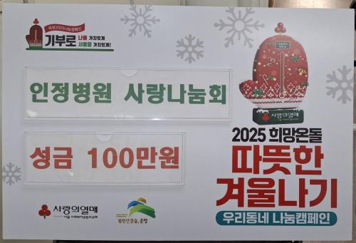 [½Åµ¿¾Æ¹æ¼Û ÀºÆò±¸=À̽ŵ¿±âÀÚ] ÀºÆò±¸ ÀÀ¾Ï3µ¿Àº ÀÎÁ¤º´¿ø »ç¶û³ª´®È¸°¡ »ç¶ûÀÇ ¼º±Ý 1¹é¸¸ ¿øÀ» Àü´ÞÇß´Ù°í ¹àÇû´Ù. À̹ø ¼º±ÝÀº ÀÎÁ¤º´¿ø »ç¶û³ª´®È¸ ÀÓÁ÷¿øµéÀÇ ÀÚ¹ßÀûÀÎ ÈÄ¿ø±ÝÀ¸·Î ¸¶·ÃµÆ´Ù. ÀÎÁ¤º´¿ø »ç¶û³ª´®È¸´Â "ÀÎÁ¤º´¿ø¿¡ º¸³»ÁØ Áö¿ª»çȸÀÇ ¸¹Àº Áö¡¦