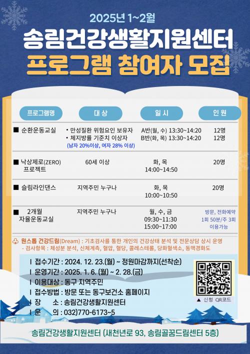[½Åµ¿¾Æ¹æ¼Û ÀÎõ= À±¹Î½Ä±âÀÚ] ÀÎõ µ¿±¸(±¸Ã»Àå ±èÂùÁø)´Â ¼Û¸²°Ç°­»ýȰÁö¿ø¼¾ÅÍ °Ç°­ ÇÁ·Î±×·¥ Âü¿©ÀÚ¸¦ ¿À´Â 23ÀϺÎÅÍ ¸ðÁýÇÑ´Ù°í ¹àÇû´Ù. À̹ø ÇÁ·Î±×·¥Àº 2025³â 1¿ù~2¿ù±îÁö ÁøÇàµÇ¸ç, Áö¿ªÁֹεéÀÇ ±Ù·Â°ú ½ÉÆó±â´É Çâ»ó¿¡ ÁßÁ¡À» µÐ ¿îµ¿ ÇÁ·Î±×·¥À¸·Î ¿î¿µ¡¦