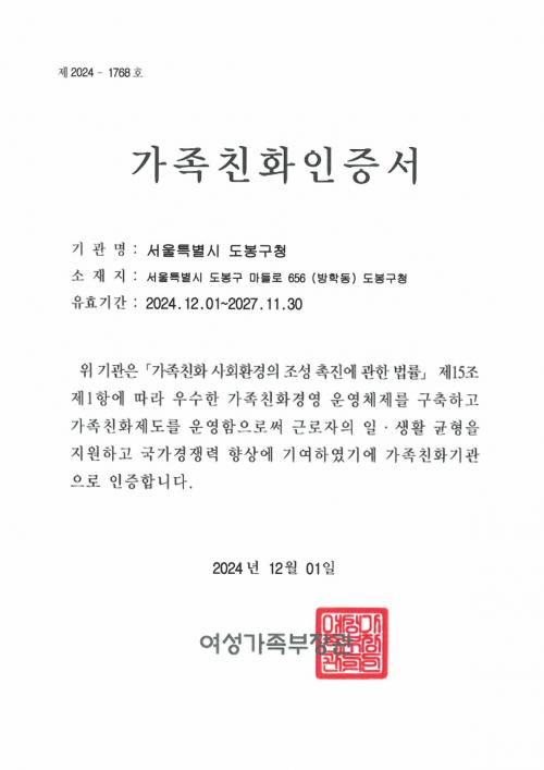 [½Åµ¿¾Æ¹æ¼Û µµºÀ±¸=À̽ŵ¿±âÀÚ] µµºÀ±¸°¡ ¿©¼º°¡Á·ºÎ·ÎºÎÅÍ °¡Á·Ä£È­±â°ü ÀçÀÎÁõÀ» ¹Þ¾Ò´Ù°í ¹àÇû´Ù. ±¸´Â 2017³â °¡Á·Ä£È­ ÃÖÃÊÀÎÁõ(2017³â~2019³â), ¿¬Àå(2020³â~2021³â), ÀçÀÎÁõ(2022³â~2024³â)¿¡ À̾î À̹ø ÀçÀÎÁõÀ¸·Î 2027³â 11¿ù±îÁö ÀÚ°ÝÀ» À¯ÁöÇÏ°Ô µÆ´Ù. ¡¦