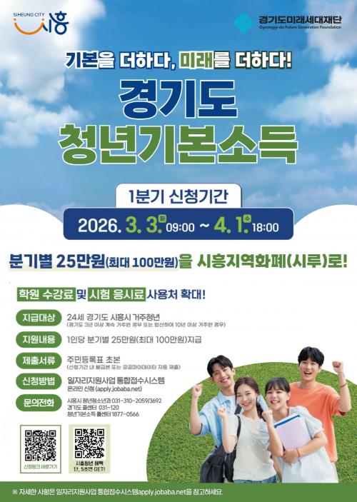 [½Åµ¿¾Æ¹æ¼Û ½ÃÈï½Ã=À̽ŵ¿±âÀÚ] ½ÃÈï½Ã´Â û³âÀÇ »çȸÀû ±âº»±Ç º¸Àå°ú Áö¿ª°æÁ¦ Ȱ¼ºÈ­¸¦ À§ÇØ 4¿ù 1ÀϱîÁö ¡®2026³â 1ºÐ±â û³â±âº»¼Òµæ¡¯ Áö±Þ ½ÅûÀ» ¹Þ´Â´Ù. ¡®Ã»³â±âº»¼Òµæ¡¯Àº °æ±âµµ¿¡ °ÅÁÖÇÏ´Â 24¼¼ û³â¿¡°Ô ºÐ±âº° 25¸¸ ¿ø¾¿ 4ºÐ±â¿¡ °ÉÃÄ ÃÖ´ë 100¸¸ ¿ø¡¦