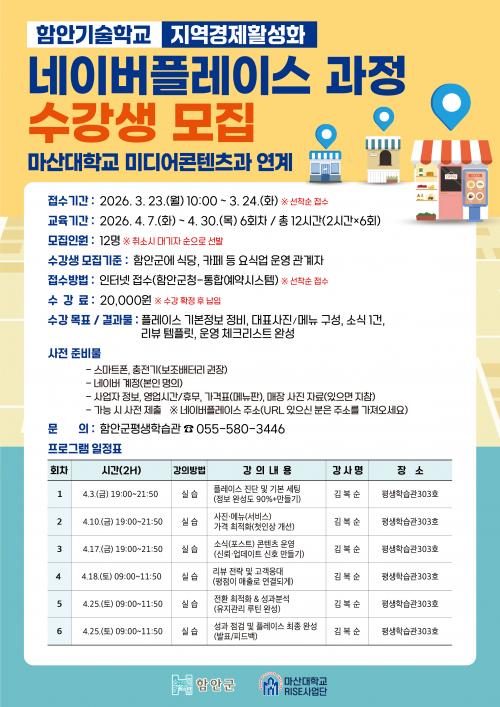 [½Åµ¿¾Æ¹æ¼Û °æ³²ÇÔ¾È=À̽ŵ¿±âÀÚ] ÇԾȱºÀº Áö¿ª ³» ¿ä½Ä¾÷ Á¾»çÀÚÀÇ ¿Â¶óÀÎ È«º¸ ¿ª·®À» °­È­Çϱâ À§ÇØ ¡®³×À̹öÇ÷¹À̽º ¿î¿µ °úÁ¤¡¯ ¼ö°­»ýÀ» 3¿ù 23ÀϺÎÅÍ ¸ðÁýÇÑ´Ù°í ¹àÇû´Ù. À̹ø ±³À°Àº ¿Â¶óÀÎ È«º¸ ¿ª·®À» °­È­ÇØ Áö¿ª ³» ½Ä´ç°ú Ä«Æä µîÀÇ ¸ÅÃâ Áõ´ë¿Í °æ¡¦