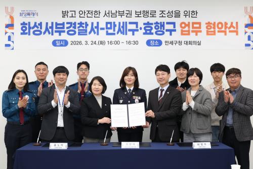 [½Åµ¿¾Æ¹æ¼Û=ÀÌÀçö±âÀÚ] È­¼ºÆ¯·Ê½Ã ¸¸¼¼±¸´Â 24ÀÏ ¸¸¼¼±¸Ã» ´ëȸÀǽǿ¡¼­ È­¼º¼­ºÎ°æÂû¼­, È¿Ç౸û°ú ÇÔ²² ¡®¹à°í ¾ÈÀüÇÑ ¼­³²ºÎ±Ç º¸Çà·Î Á¶¼ºÀ» À§ÇÑ ¾÷¹«Çù¾à(MOU)¡¯À» ü°áÇß´Ù°í ¹àÇû´Ù. À̹ø Çù¾àÀº ¾îµÎ¿î º¸Çà·Î¿Í ¹üÁË Ãë¾àÁö¿ª¿¡ ¼±Á¦ÀûÀ¸·Î ´ëÀÀÇØ ½Ã¹Î¡¦