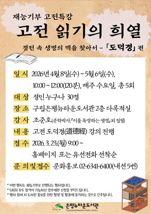 [½Åµ¿¾Æ¹æ¼Û ÀºÆò±¸=À̽ŵ¿±âÀÚ] ¼­¿ï ÀºÆò±¸´Â ±¸¸³ÀºÆò´ºÅ¸¿îµµ¼­°üÀÌ Àι®ÇÐÀû ¼Ò¾çÀ» ³ôÀÌ°í Æò»ýÇнÀ ±âȸ¸¦ È®´ëÇϱâ À§ÇØ °íÀü °­Á ¡®°íÀü ÀбâÀÇ Èñ¿­-µµ´ö°æ Æí¡¯À» ¿î¿µ ÁßÀ̶ó°í ¹àÇû´Ù. À̹ø °­Á´ ³ëÀÚÀÇ »ç»óÀ» ´ãÀº µ¿¾ç °íÀü ¡®µµ´ö°æ¡¯À» ÅëÇØ »î¡¦