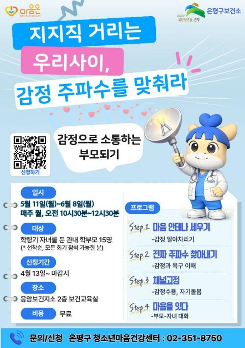 [½Åµ¿¾Æ¹æ¼Û ÀºÆò±¸=À̽ŵ¿±âÀÚ] ¼­¿ï ÀºÆò±¸´Â ºÎ¸ð Áý´Ü»ó´ã ÇÁ·Î±×·¥ ¡®°¨Á¤À¸·Î ¼ÒÅëÇÏ´Â ºÎ¸ð µÇ±â - ÁöÁöÁ÷°Å¸®´Â ¿ì¸® »çÀÌ, °¨Á¤ Á֯ļö¸¦ ¸ÂÃç¶ó¡¯¸¦ ¿î¿µÇÑ´Ù°í ¹àÇû´Ù. À̹ø ÇÁ·Î±×·¥Àº ÀºÆò±¸º¸°Ç¼Ò û¼Ò³â¸¶À½°Ç°­¼¾ÅÍ ¡®¸¶À½¿Â¡¯¿¡¼­ ÁÖ°üÇϸç, ÀÚ³àÀÇ¡¦