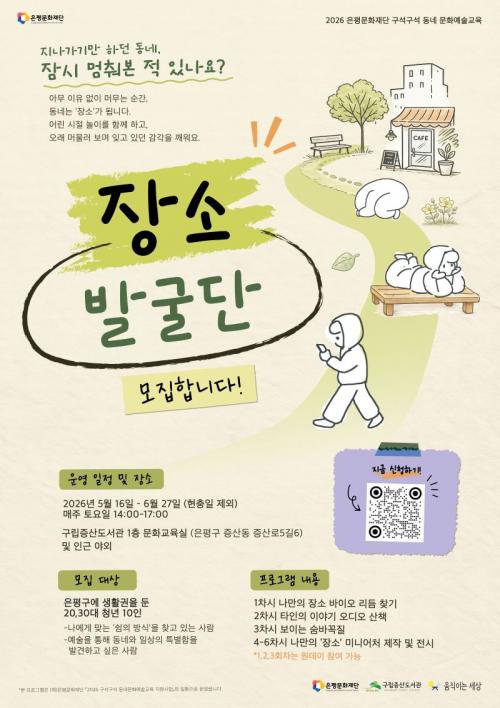 [½Åµ¿¾Æ¹æ¼Û ÀºÆò±¸=À̽ŵ¿±âÀÚ] ¼­¿ï ÀºÆò±¸´Â ´ÙÀ½ ´Þ 16ÀϺÎÅÍ ±¸¸³Áõ»êµµ¼­°ü¿¡¼­ ÀºÆò¹®È­Àç´ÜÀÌ ÁÖ°üÇÏ´Â 2026³â ¡®±¸¼®±¸¼® µ¿³× ¹®È­¿¹¼ú±³À°¡¯ Áö¿ø»ç¾÷ÀÇ ÀÏȯÀ¸·Î °ø¸ð¿¡ ¼±Á¤µÈ ¿¹¼ú±³À° ÇÁ·Î±×·¥ ¡®Àå¼Ò¹ß±¼´Ü¡¯À» ¿î¿µÇÑ´Ù°í ¹àÇû´Ù. ¡®Àå¼Ò¹ß±¼´Ü¡¯ ÇÁ¡¦