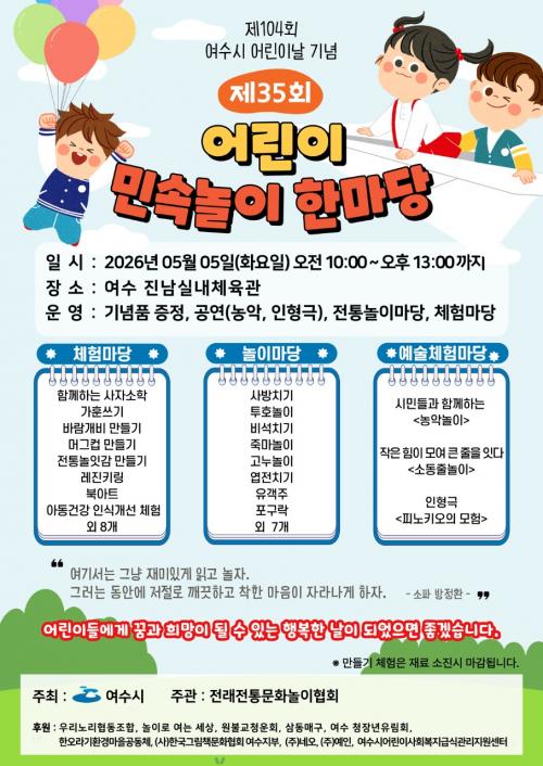 [½Åµ¿¾Æ¹æ¼Û ¿©¼ö=±è±â³² ±âÀÚ] ¿©¼ö½Ã´Â Á¦104ȸ ¾î¸°À̳¯À» ¸Â¾Æ 5¿ù 5ÀÏ, ¾ÆÀ̵éÀÌ °¡Á·°ú ÇÔ²² ÀüÅ빮ȭ¸¦ Áñ±â¸ç ¸¶À½²¯ ¶Ù³î ¼ö ÀÖ´Â ¹Î¼Ó³îÀÌ ³îÀÌ ÇѸ¶´çÀ» °³ÃÖÇÑ´Ù. À̹ø Çà»ç´Â ¾Æµ¿ ģȭµµ½Ã ¸í¼º¿¡ °É¸Â°Ô ¾î¸°À̵鿡°Ô ÇູÇÑ Ãß¾ïÀ» ¼±»çÇϰíÀÚ ¸¶·Ã¡¦